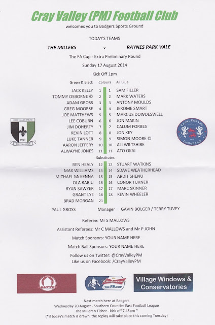 The Millers made it three defeats on the spin after unbeaten Combined Counties League side Raynes Park comfortably booked a trip to Ryman League Division One South newcomers East Grinstead in the FA Cup Preliminary Round. Raynes Park opened the scoring inside 9 minutes when Lee Coburn headed into his own net following a free kick. But Cray equalised within six minutes when striker Aaron Jeffrey stroked home the club's first goal in 195 minutes of football.RPV sealed a deserved victory when striker Simon Moore slotted home a penalty after 50 minutes, before Marcus Dowdeswell came up from the back in the 68th minute to plant a free header into the goal from a corner kick.